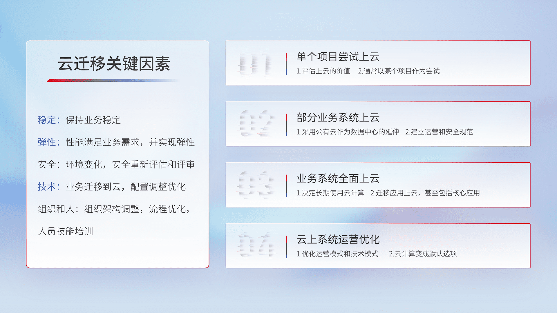 结合实际业务,,,,从规划设计、、、、云平台选型、、、、云原生改造、、、数据迁移、、、、集成交付,,迁移全过程为客户识别最佳上云路径,,,,做好风险识别管理,,设计网络架构、、、身份权限、、安全审计合规、、、、操作审计、、日志审计、、监控告警策略、、多站点容灾设计等,,对云上基础设施进行整体规划,,提升IT治理水平,,以满足弹性、、、、高可用、、高性能的需求。。