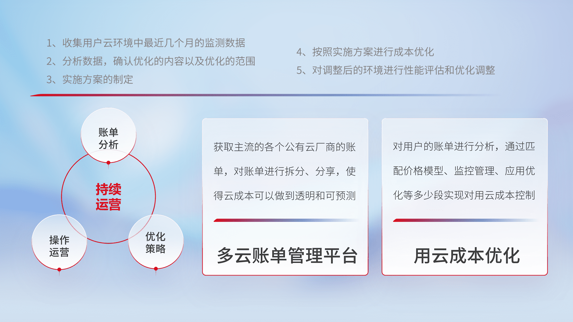 通过多云纳管,,,以统一的资源数据模型把客户的云资源进行抽象和封装,,进而实现对多云资源的统一操作,,,,保障云资源管理的可靠性、、稳定性与可用性。。。量身定制化运维内容,,,配置、、、开发运维、、补丁管理、、备份、、、监控、、认证和访问管理、、、审计和日常巡检等,,保障在用云过程中的可靠度,,,,稳定度以及高可用率。。。。